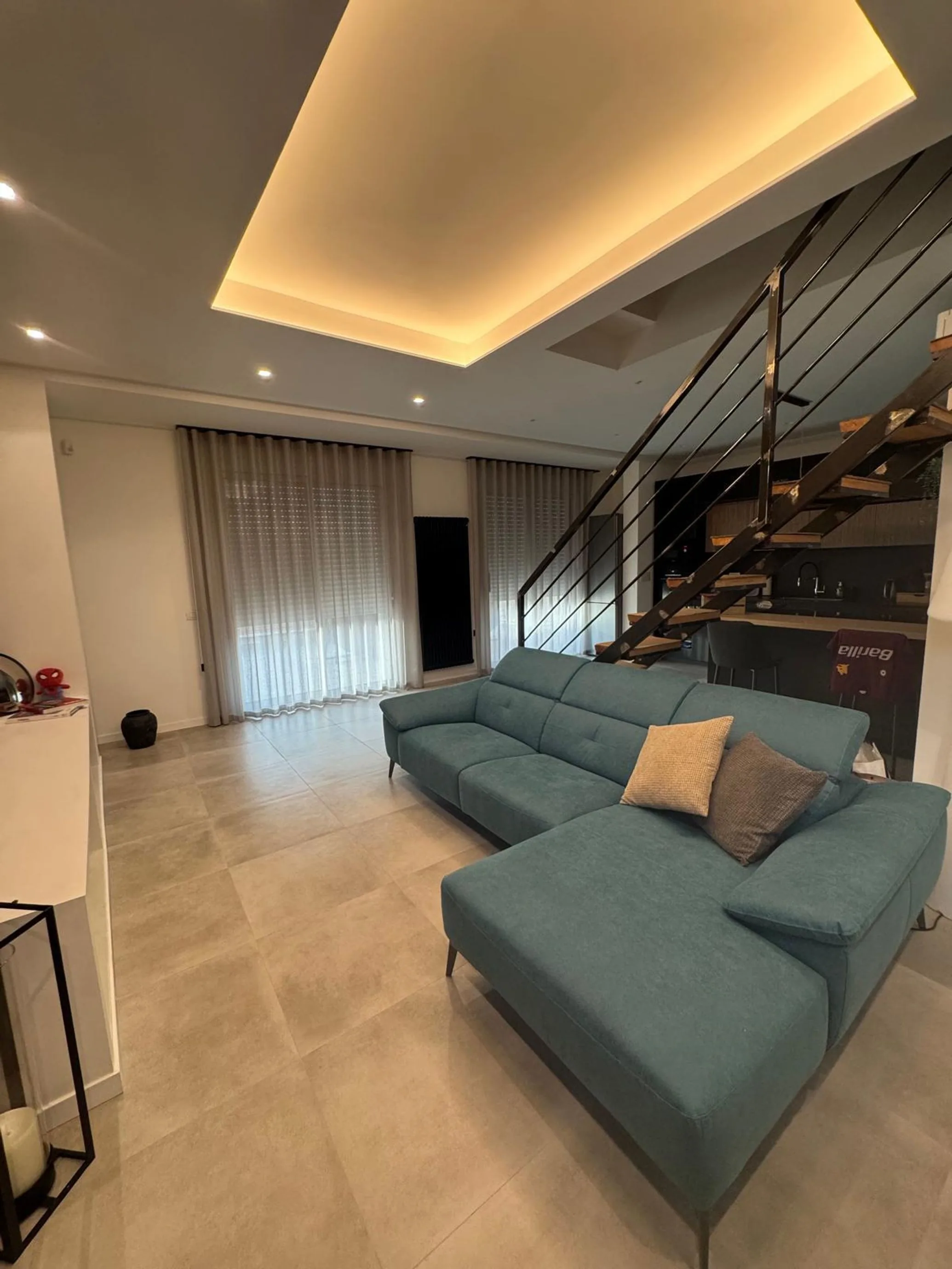 90 metri quadri su due livelli, rimessi a nuovo da cima a fondo. Abbiamo ripensato ogni superficie: pavimenti in gres porcellanato posati a regola d'arte, controsoffitti con LED integrati, pareti ripulite fino al mattone originale.